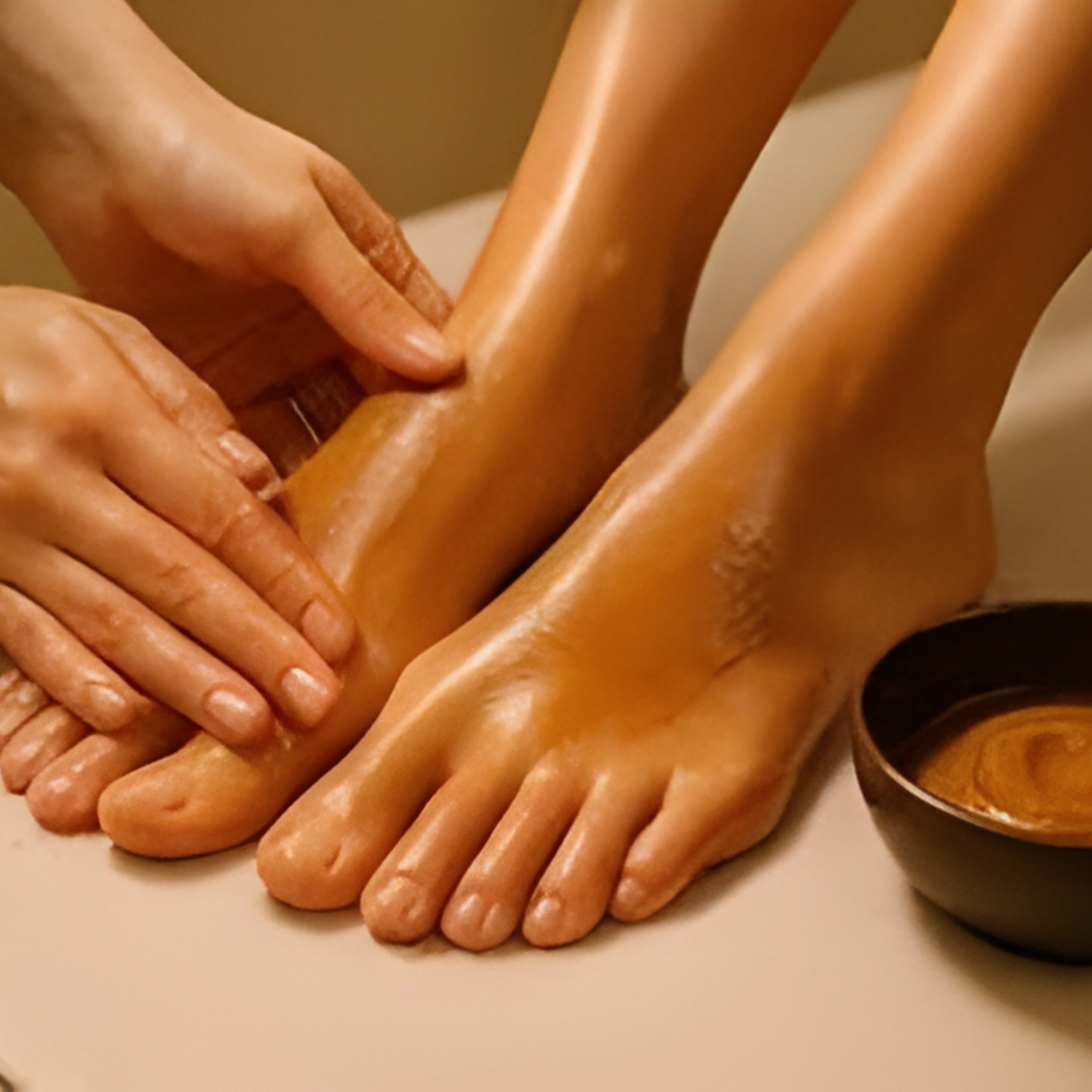This detox pedicure uses pumpkin enzymes and moor clay to draw out toxins, exfoliate dead skin, soften cracked heels, and refresh tired feet. It improves circulation and restores softness with deep cleansing and long-lasting freshness. Wrapped in pumkin leaves